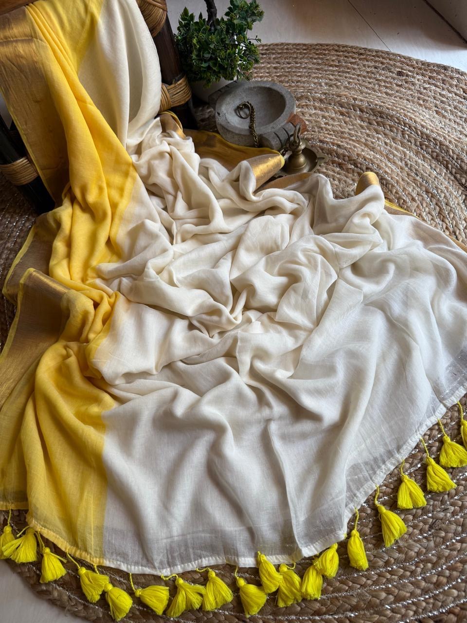 Pure mul cotton saree designed with contrast golden paar and handmade tasseled pallu.