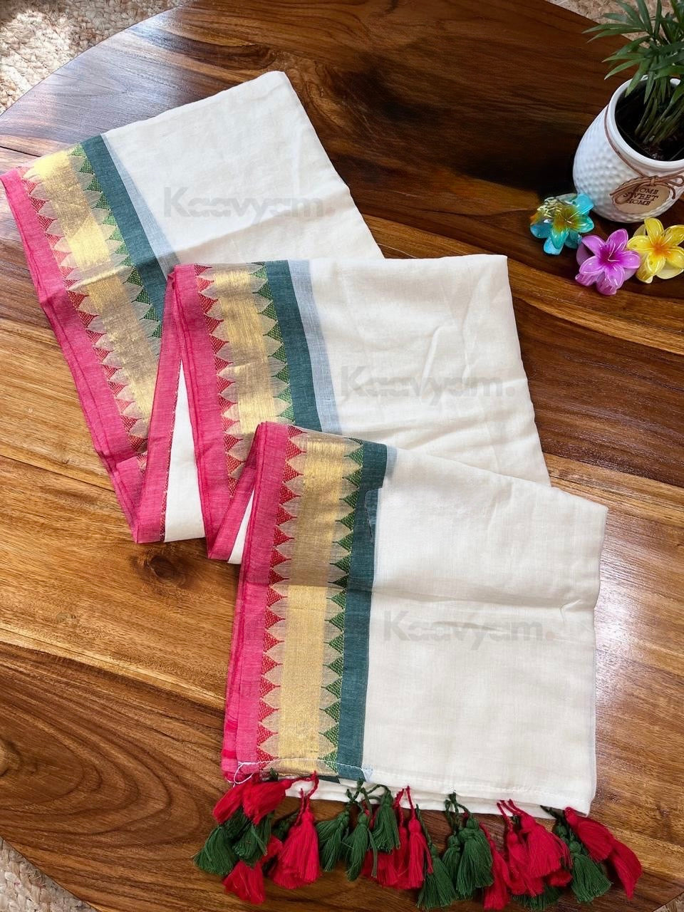 Pure mul cotton saree designed with contrast golden paar and handmade tasseled pallu.