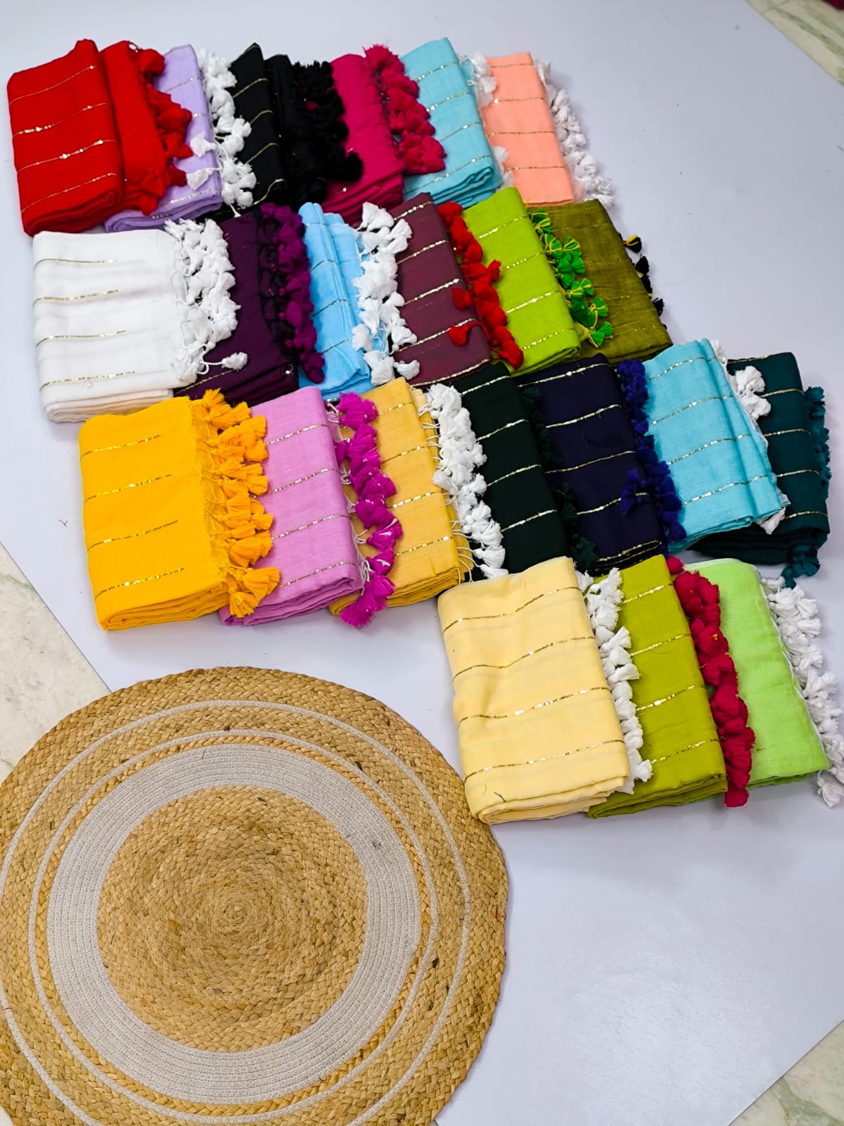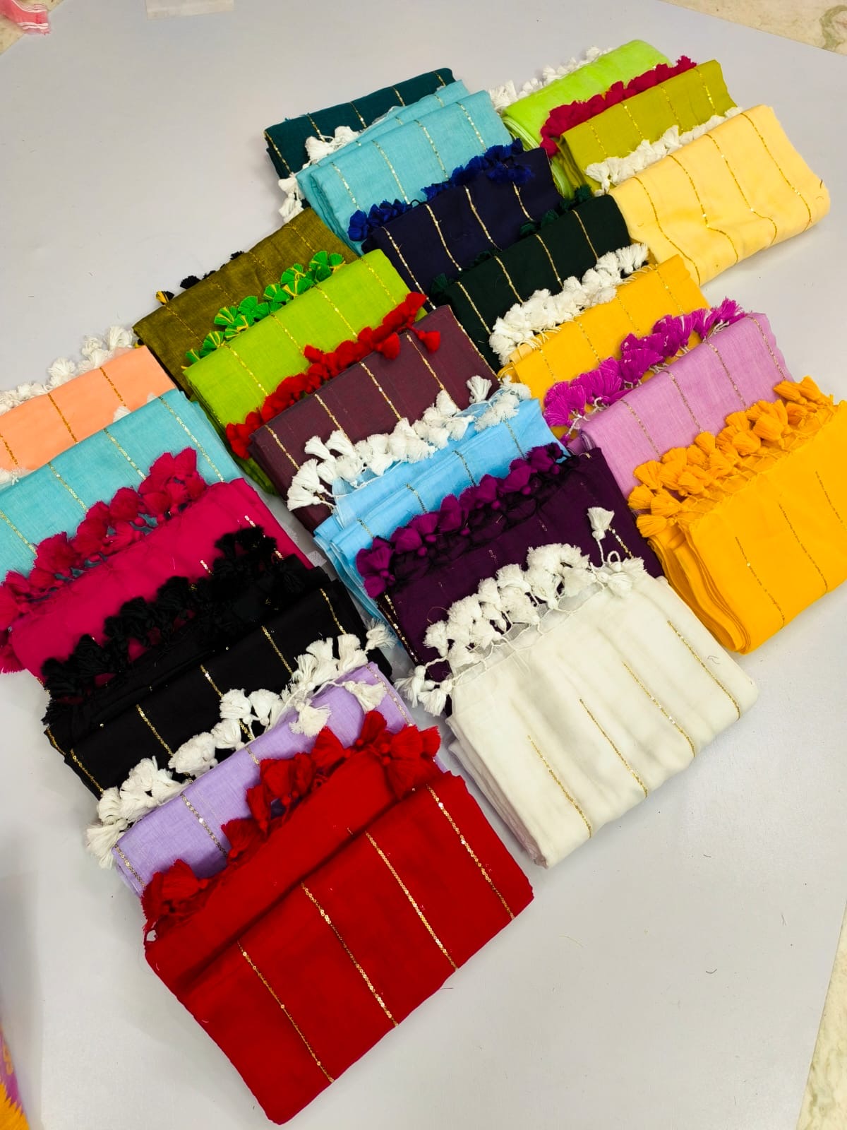 Pure mul cotton saree designed with contrast golden sequins and handmade tasseled pallu.
