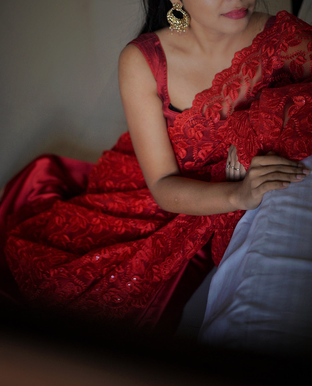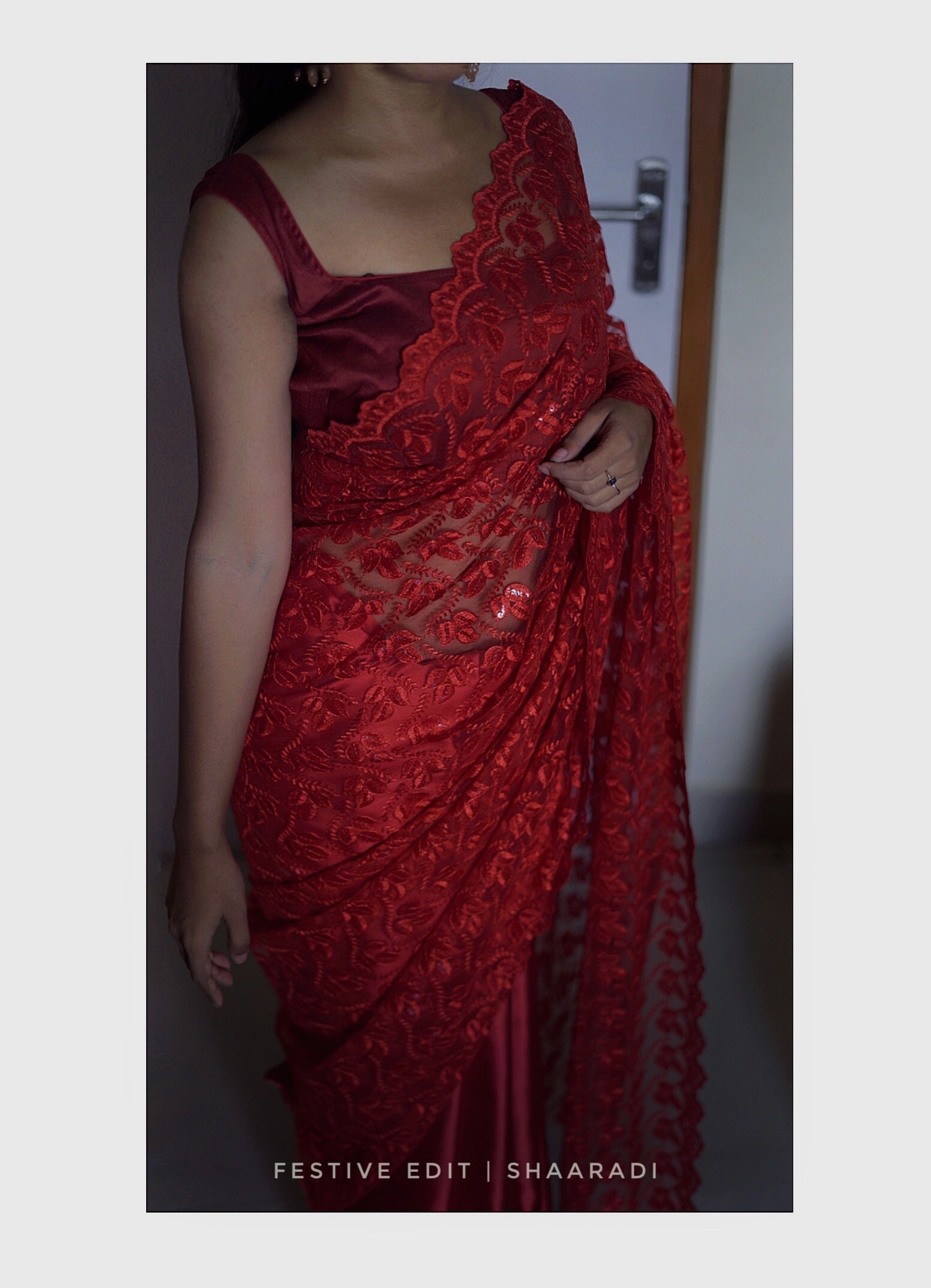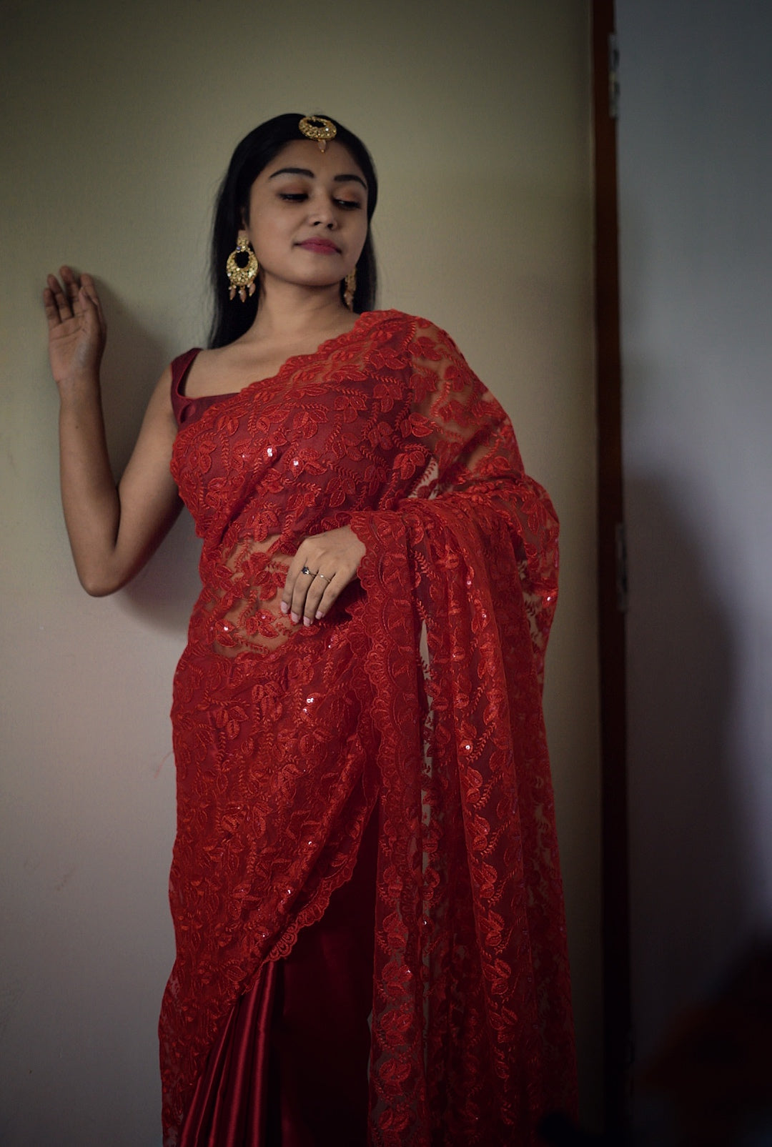 Sequins embellished embroidered net saree paired with silk satin pleats.