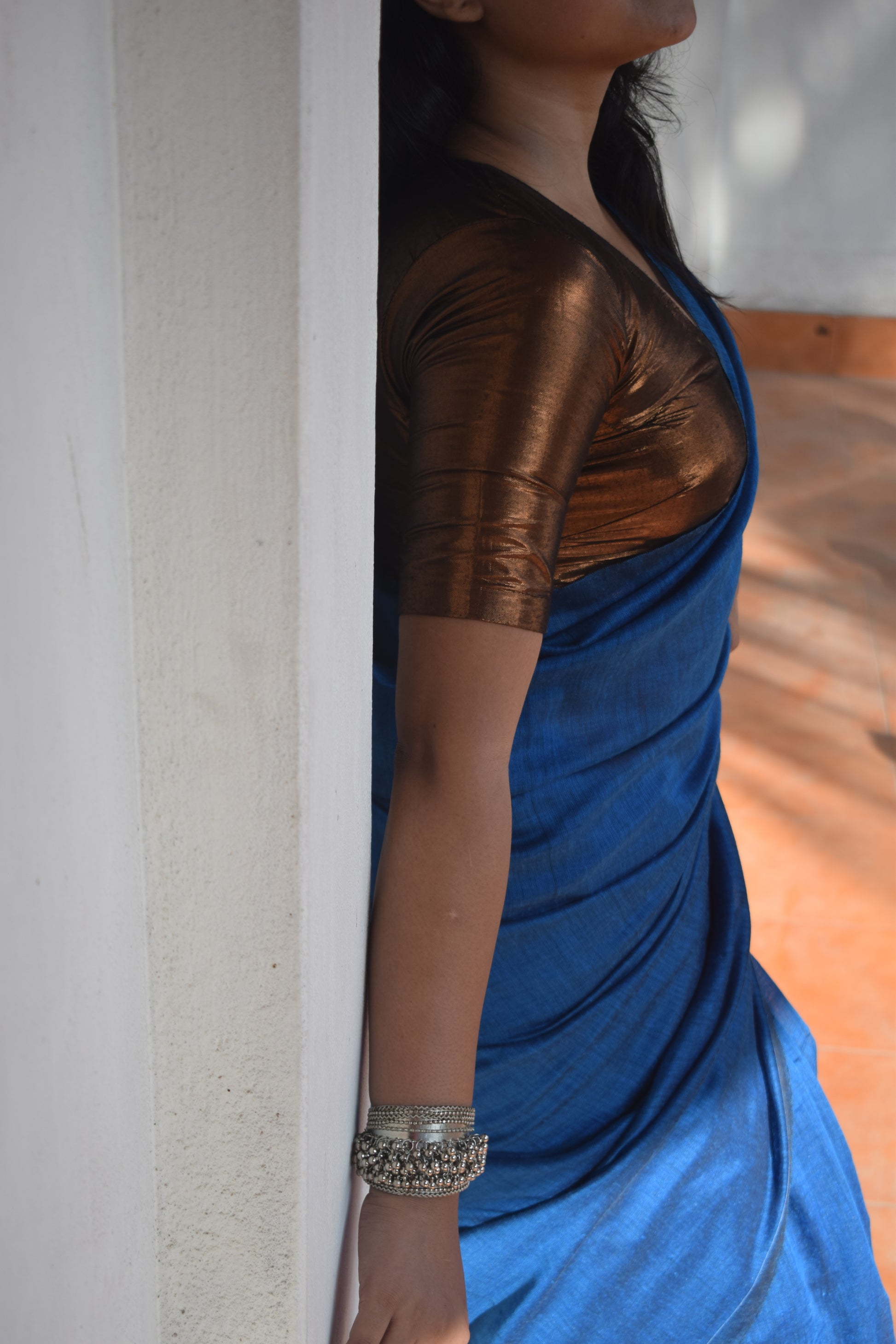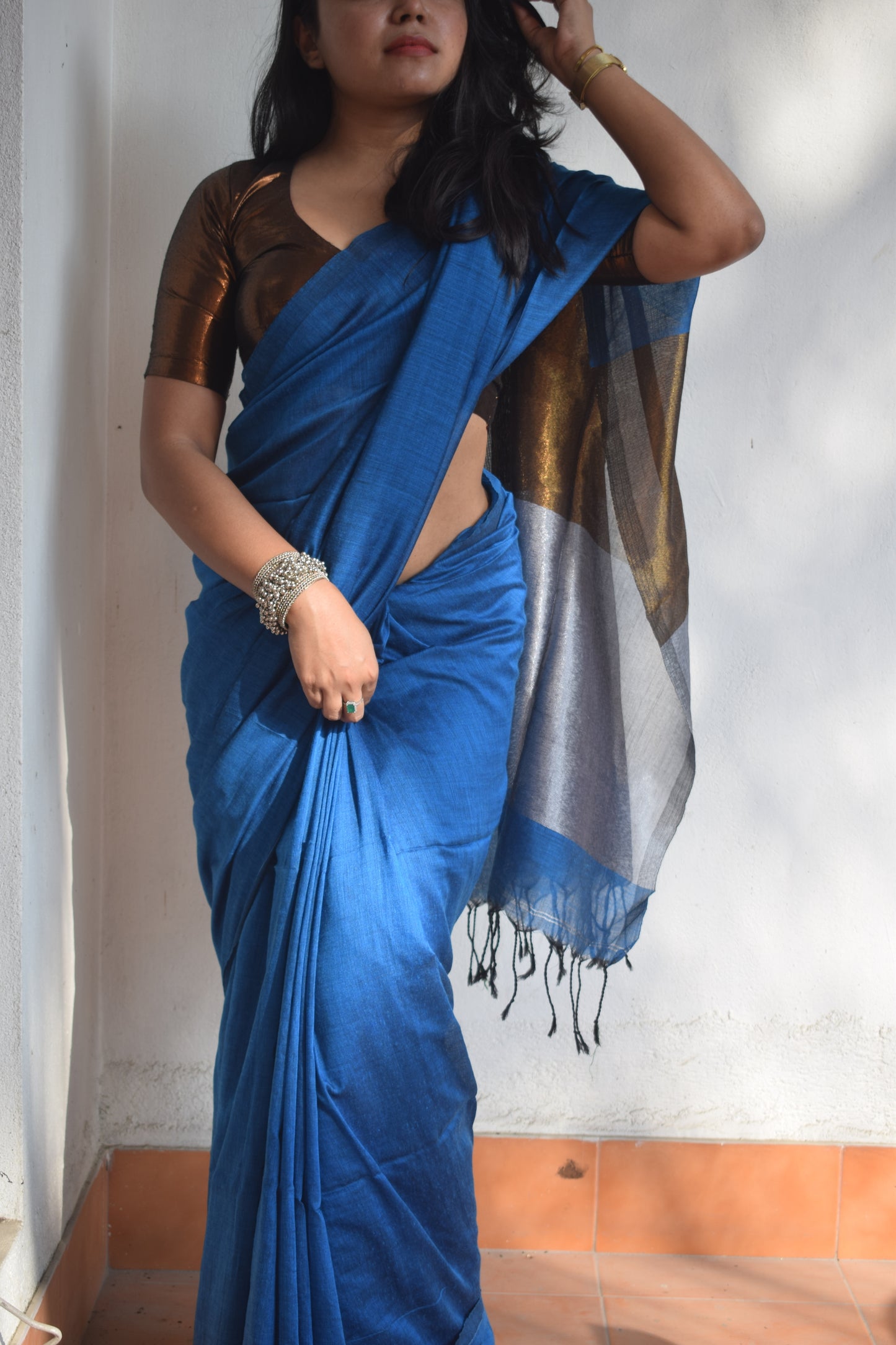 Silver and copper zari waved in pallu teal blue cotton silk handloom saree.